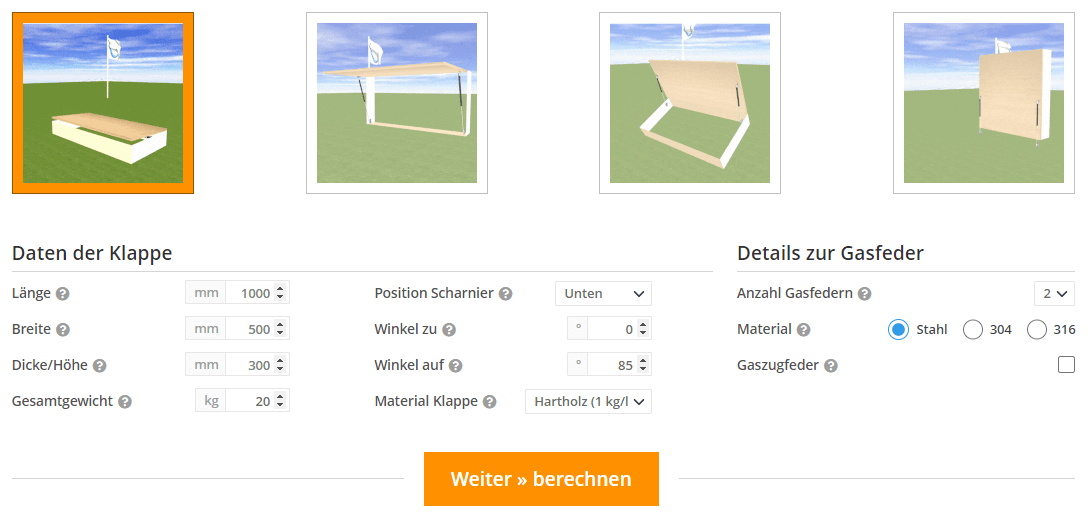 Sind Sie neugierig darauf, wie die Gasfedern an einer Holzkiste aussehen werden? Nach Eingabe der Daten in das Berechnungstool erhalten Sie eine Simulation des gesamten Bildes. Danach sehen Sie eine Bestellübersicht und können die Produkte auf einen Schlag in Ihren Warenkorb legen.