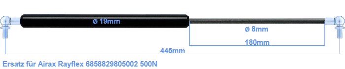 Ersatz Gasdruckfeder für Airax Rayflex 6858829805002 500 Newton. Geeignet für Kugeln mit Durchmesser von 10mm. Die Kugel ist inbegriffen. Marke: Hahn Gasfedern.