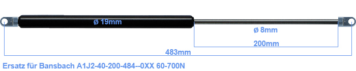 Ersatz Gasdruckfeder für Bansbach A1J2-40-200-484--0XX 50-800 Newton. Die Stärke des Auges beträgt 10mm und der Lochdurchmesser ist 8.1mm. Marke: Hahn Gasfedern.