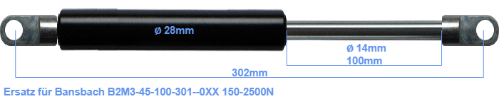 Ersatz Gasdruckfeder für Bansbach B2M3-45-100-301--0XX 150-2500 Newton. Die Stärke des Auges beträgt 10mm und der Lochdurchmesser ist 10.1mm. Marke: Hahn Gasfedern.