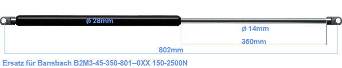Ersatz Gasdruckfeder für Bansbach B2M3-45-350-801--0XX 150-2500 Newton. Die Stärke des Auges beträgt 10mm und der Lochdurchmesser ist 10.1mm. Marke: Hahn Gasfedern.