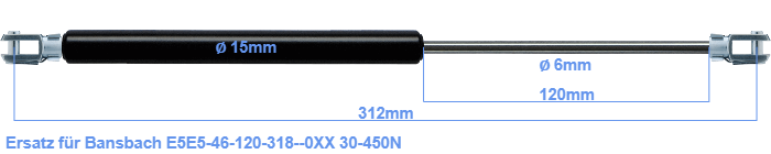 Ersatz Gasdruckfeder für Bansbach E5E5-46-120-318--0XX 30-450 Newton. Der Gabelkopf hat einen Lochdurchmesser von 5.1mm. Marke: Hahn Gasfedern.