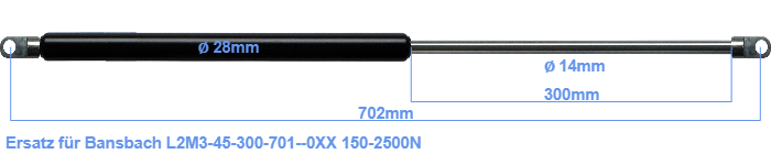 Ersatz Gasdruckfeder für Bansbach L2M3-45-300-701--0XX 150-2500 Newton. Die Stärke des Auges beträgt 10mm und der Lochdurchmesser ist 10.1mm. Marke: Hahn Gasfedern.