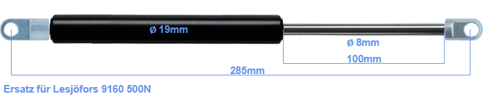 Ersatz Gasdruckfeder für Lesjöfors 9160 500 Newton. Anschluss Druckrohr: Die Stärke des Auges beträgt 5mm und der Lochdurchmesser ist 8.1mm. Anschluss Kolbenstange: Die Stärke des Auges beträgt 10mm und der Lochdurchmesser ist 8.1mm. Marke: Hahn Gasfedern.