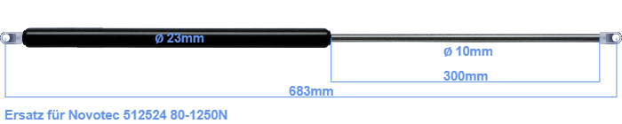 Ersatz Gasdruckfeder für Novotec 512524 80-1250 Newton. Die Stärke des Auges beträgt 10mm und der Lochdurchmesser ist 8.1mm. Marke: Hahn Gasfedern.