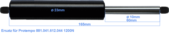 Ersatz Gasdruckfeder für Protempo 881.041.612.044 1200 Newton. Gewinde: M8. Marke: Hahn Gasfedern.