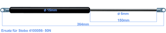 Ersatz Gasdruckfeder für Stobo 4100056- 50 Newton. Die Stärke des Auges beträgt 3mm und der Lochdurchmesser ist 6.1mm. Marke: Hahn Gasfedern.