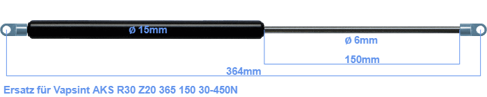 Ersatz Gasdruckfeder für Vapsint AKS R30 Z20 365 150 30-450 Newton. Die Stärke des Auges beträgt 3mm und der Lochdurchmesser ist 6.1mm. Marke: Hahn Gasfedern.